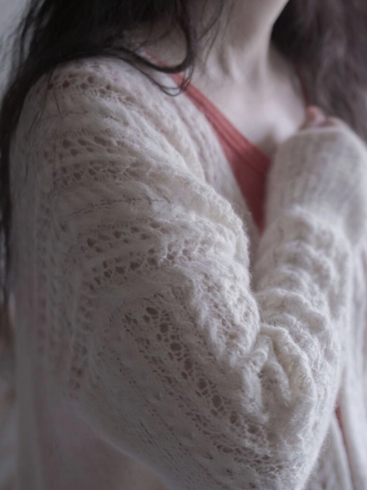 숲닛츠에서는 아주 귀한 레이스 무늬 패턴의 카디건입니다. 선선한 날씨에 걸치기 좋고, 겨울에는 이너웨어로 입기도 좋아요.