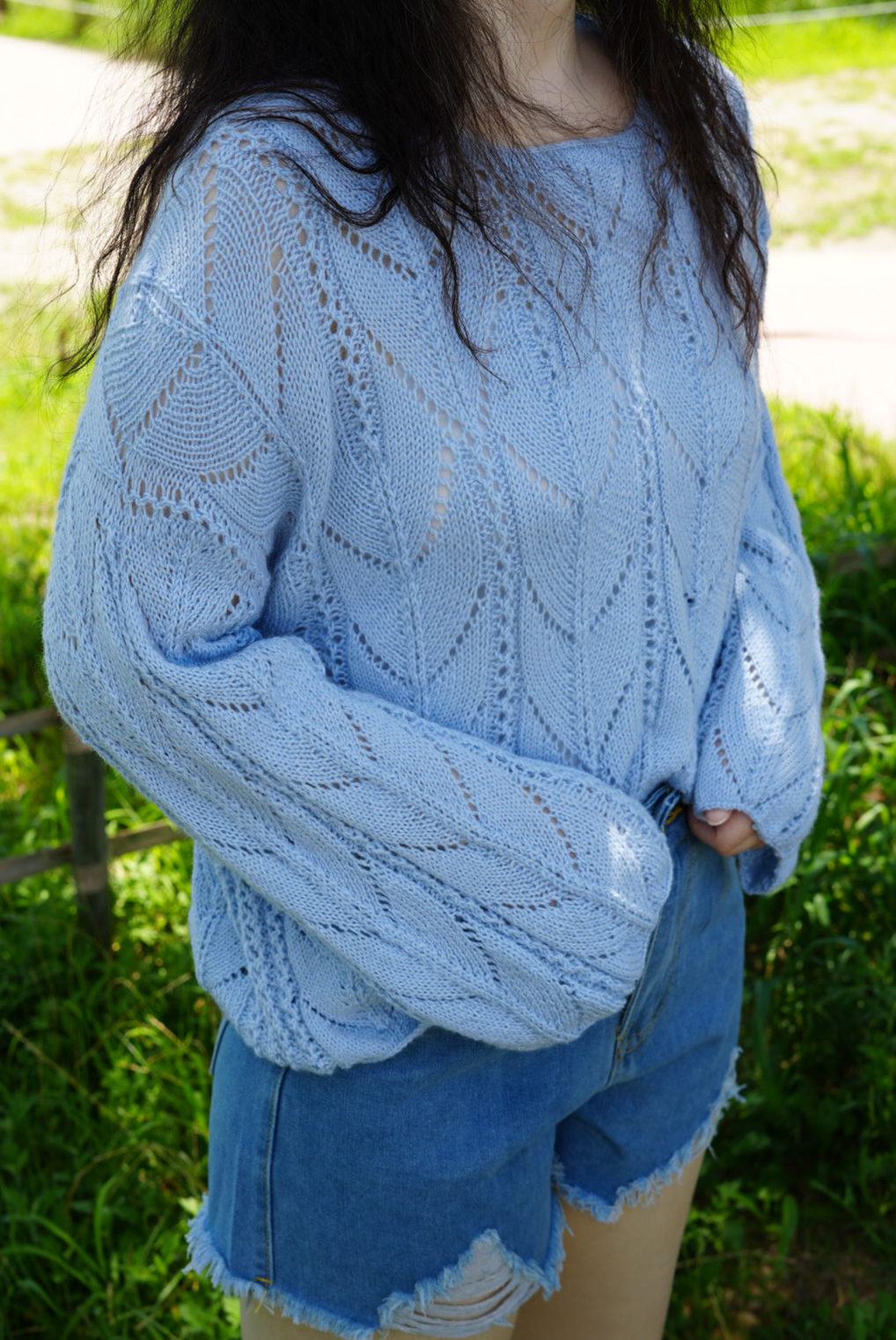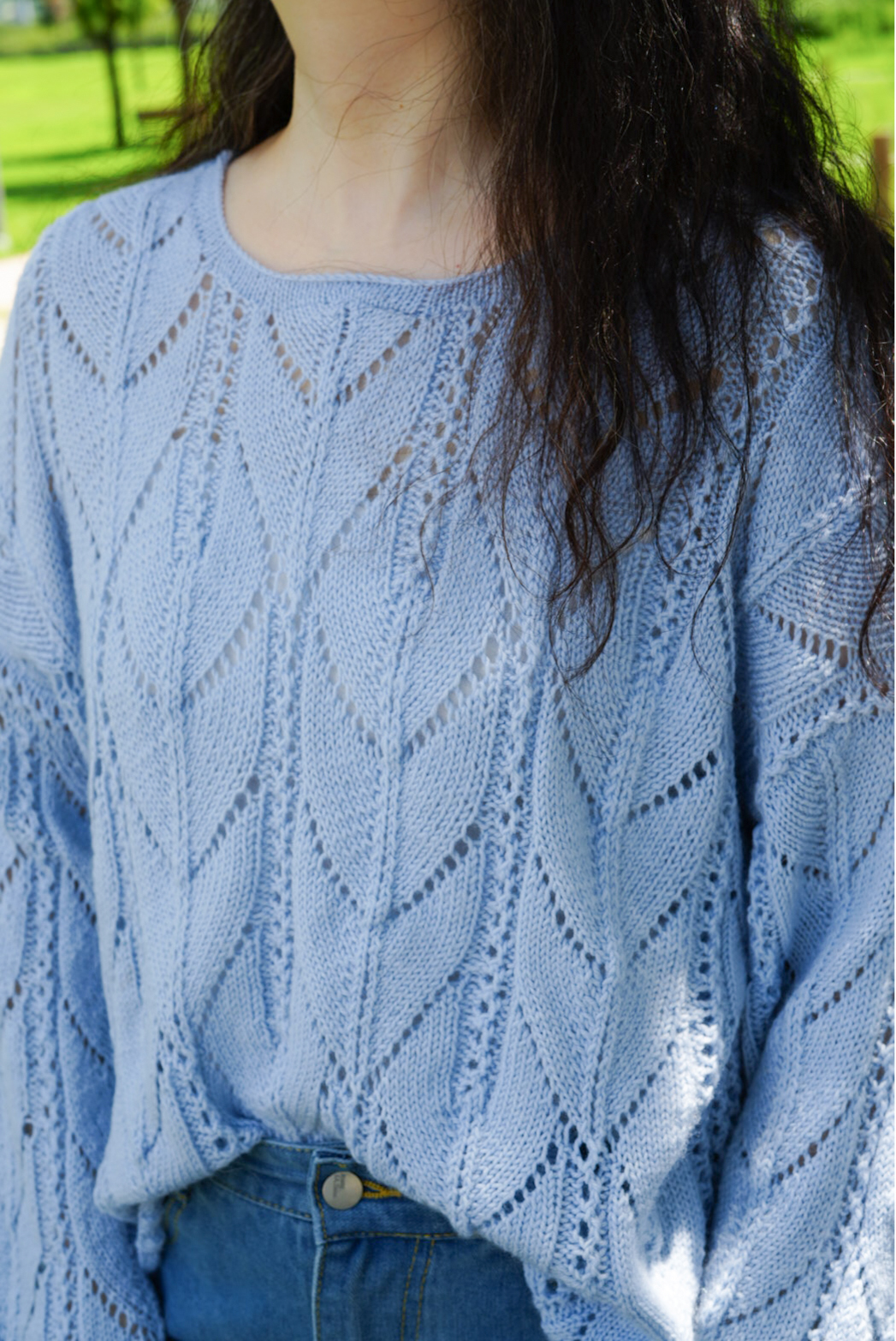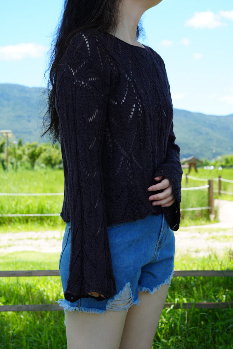 튤립 헤이즈 탑은 어깨부터 시작하는 탑다운으로 차트를 보며 레이스 무늬를 뜬다. 뒤판 어깨에서 암홀까지 평면뜨기 한 후 어깨에서 코를 주워 앞판을 뜬다. 겨드랑이에서 앞판과 뒤판을 합쳐 원통뜨기 하여 몸통을 뜨고 암홀을 따라 코를 주워 소매를 원통뜨기 한다. 마지막으로 네크라인을 따라 코를 주워 넥밴드를 뜬다.