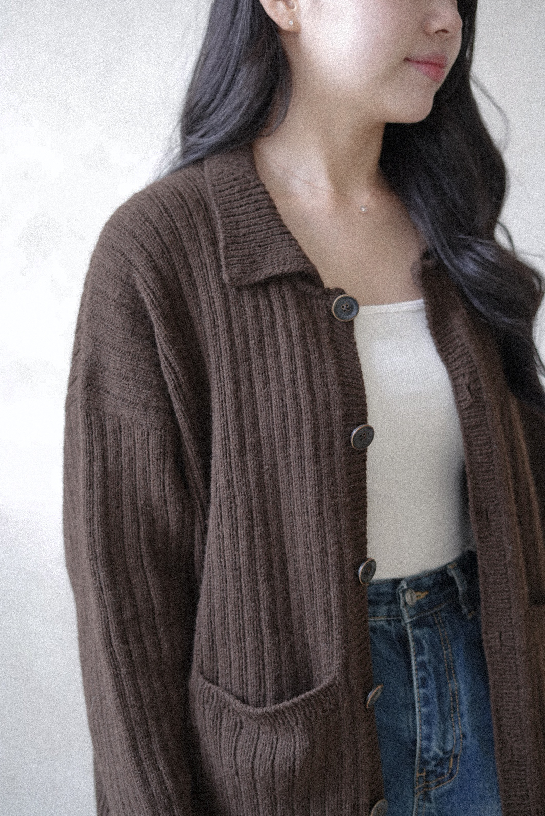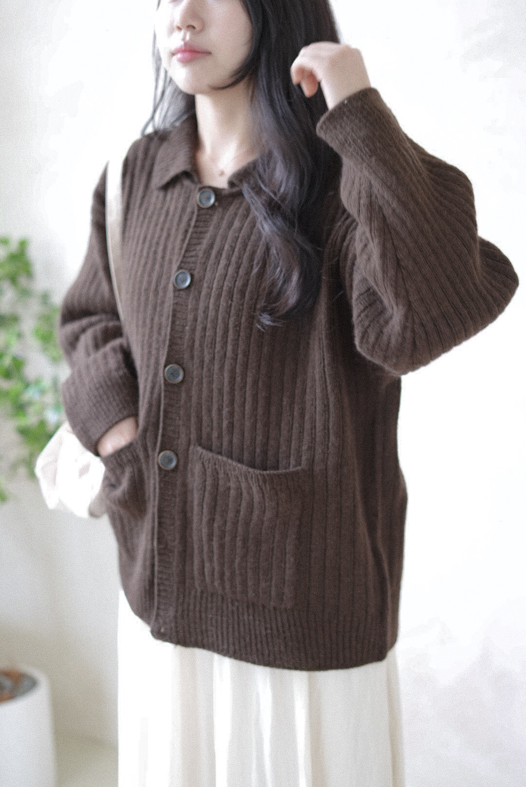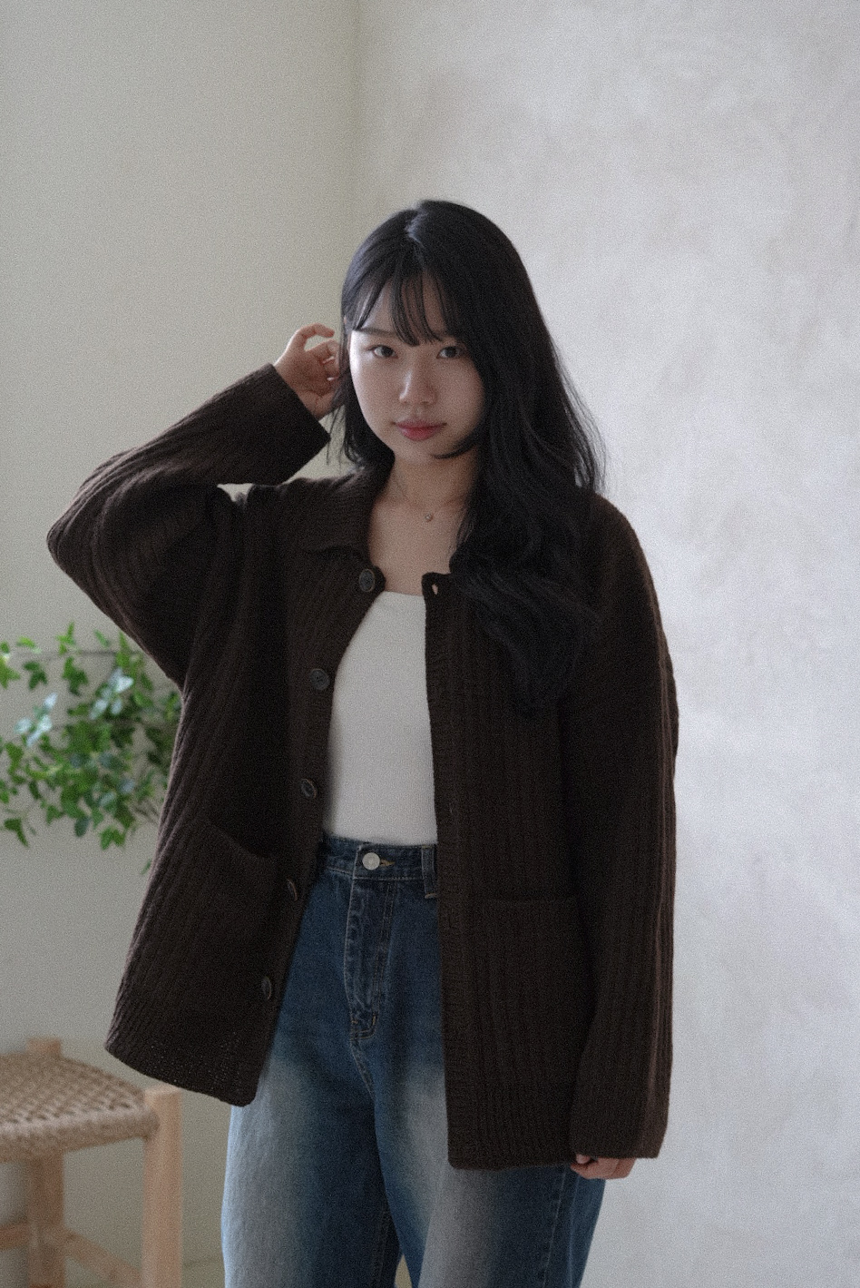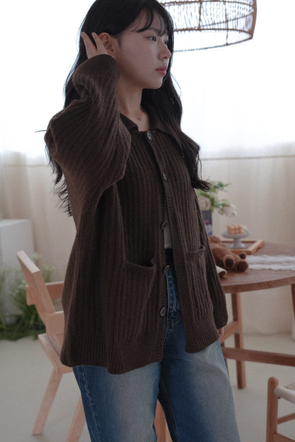 손뜨개 의류치고는 하이게이지로 제작되어 조직이 단정하고 세련된 인상을 줍니다. 가볍지만 탄탄하게, 일상 속에서 오래 입을 수 있는 카디건입니다.