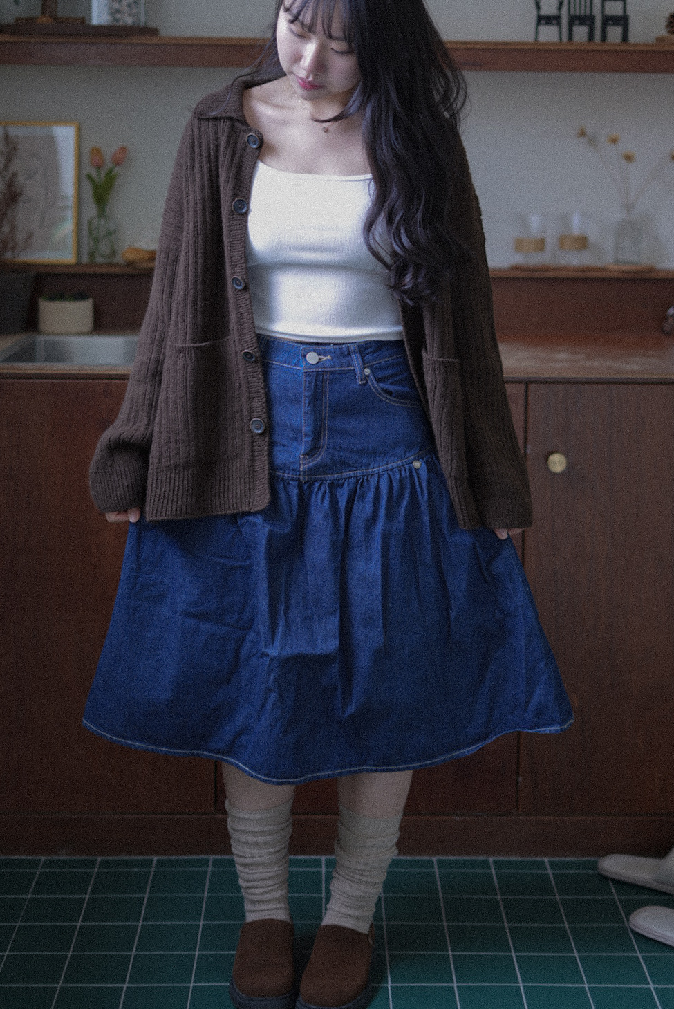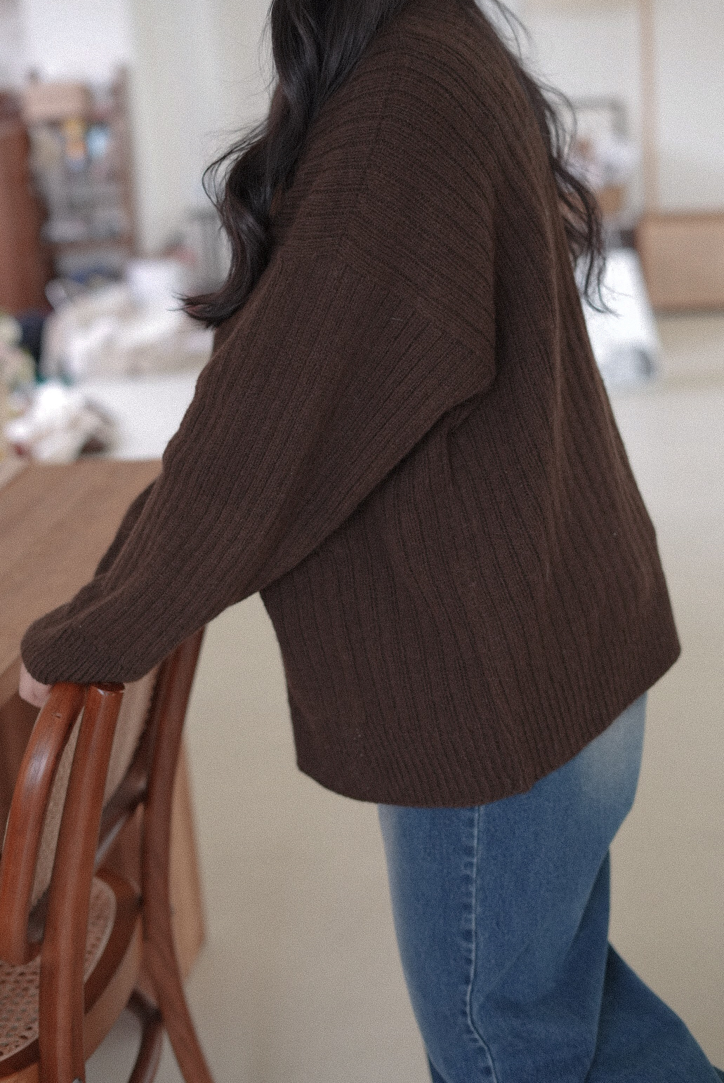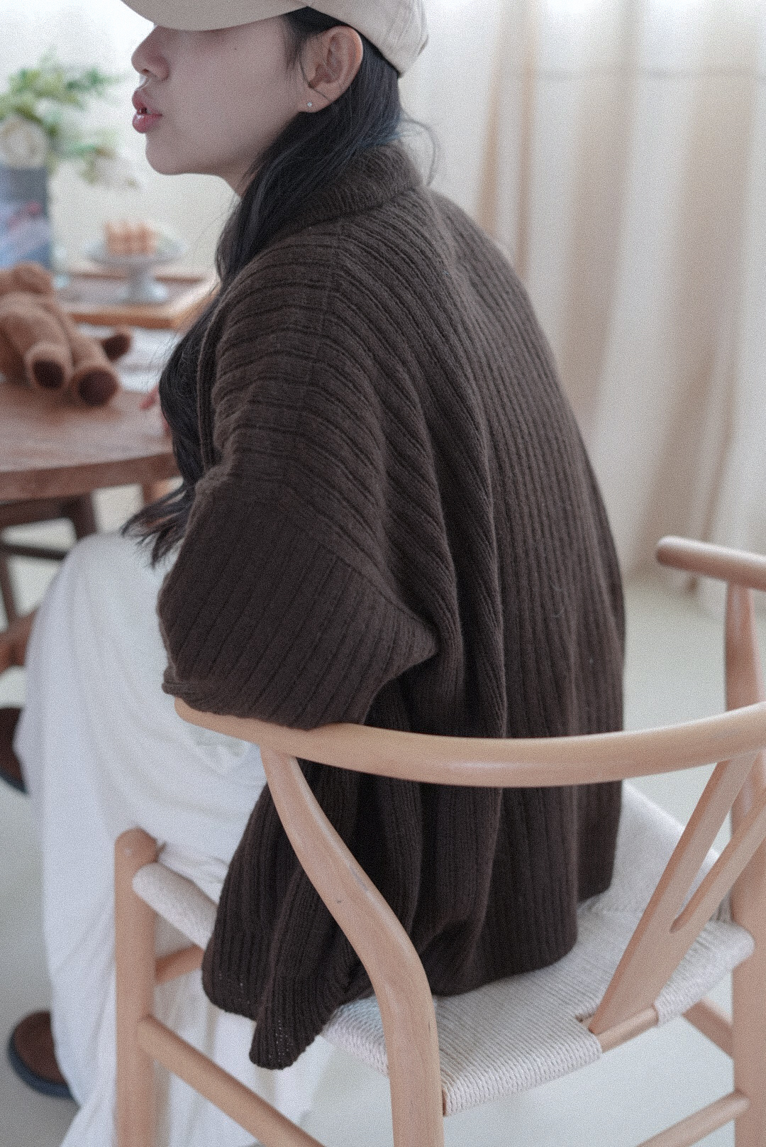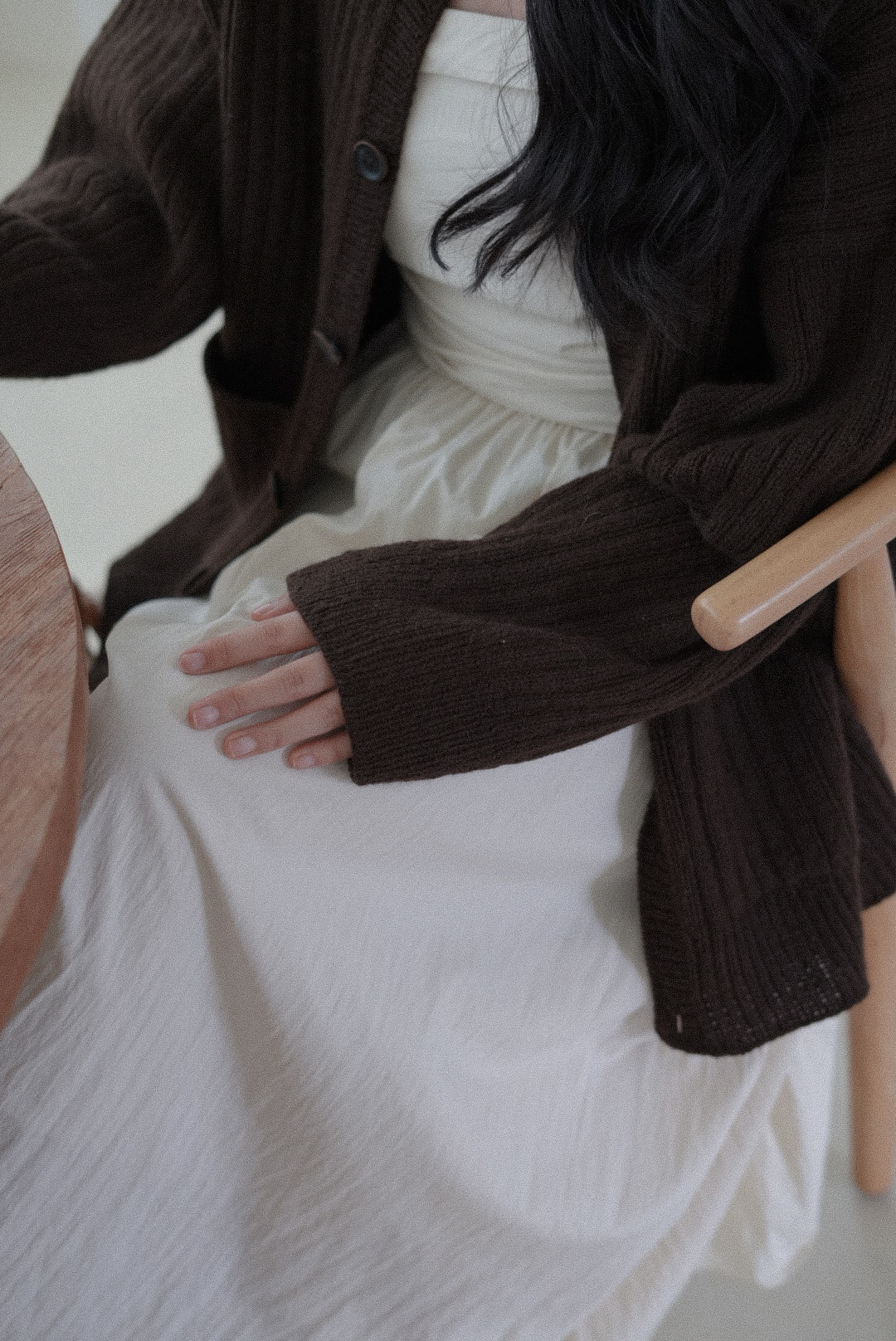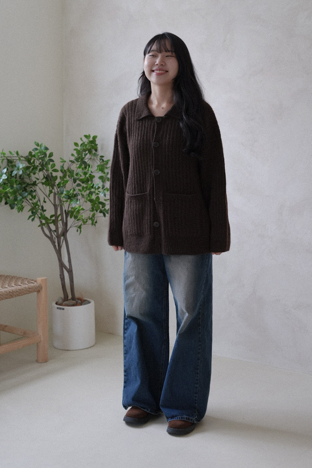 손뜨개 의류치고는 하이게이지로 제작되어 조직이 단정하고 세련된 인상을 줍니다. 가볍지만 탄탄하게, 일상 속에서 오래 입을 수 있는 카디건입니다.