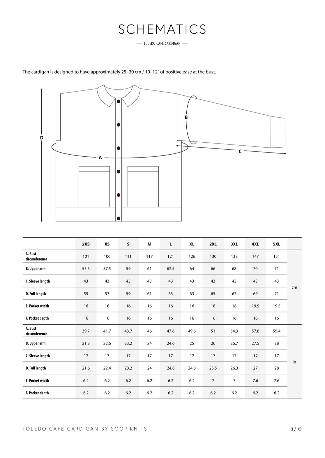 카디건은 뒤판 어깨에서 시작한다. German short rows 방식을 사용해 어깨 경사를 만들고 겨드랑이까지 진동을 뜬다. 뒤판을 잠시 쉬게 두고 어깨에서 코를 주워 오른쪽 앞판과 왼쪽 앞판을 뜬 뒤, 겨드랑이에서 모두 합쳐 몸통을 이어서 뜬다. 몸통의 주머니는 몸통을 뜨면서 위치를 표시해 놓고 나중에 주머니 속을 만든다. 진동 둘레를 따라 코를 주워 소매를 원통뜨기 하고, 네크라인을 따라 코를 주워 칼라를 만든다. 카디건의 앞섶을 따라 코를 주워 버튼 밴드를 만들고 주머니를 완성한다.